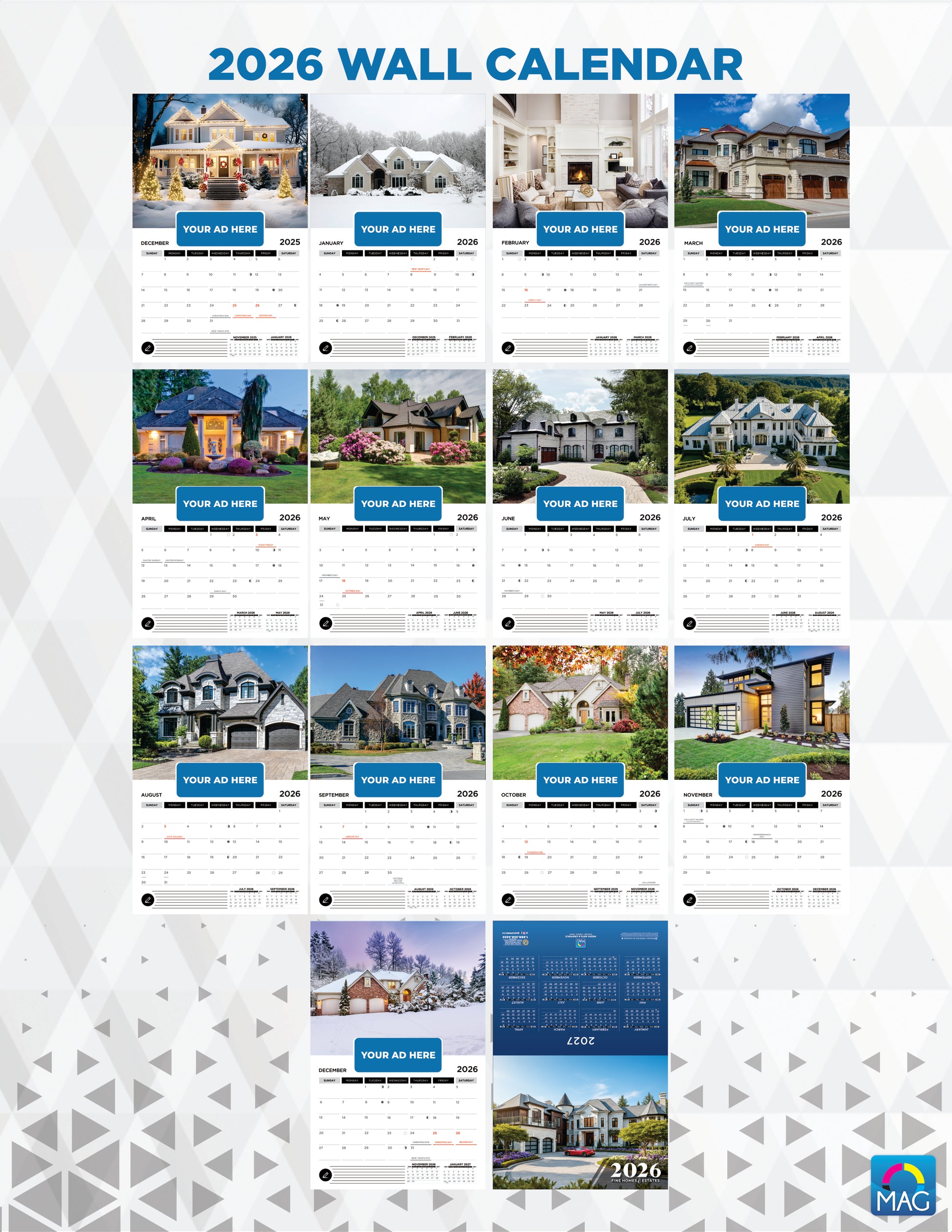 Delight your clients with a sophisticated gift that keeps your business top of mind every day. Our Real Estate-Themed Wall Calendars are designed to impress, combining stunning visuals, premium print quality, and strategic ad placement to ensure your brand is front and center all year long. Perfect for realtors, mortgage agents, and service professionals who want to stay visible long after the deal is done.